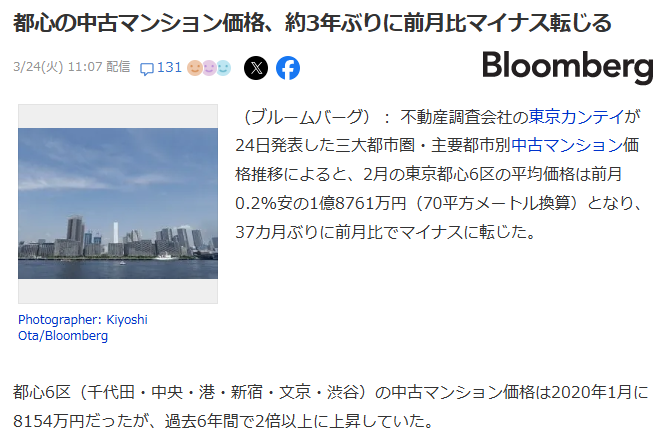 都心の中古マンションの価格が3年ぶりに前月比マイナスに転じたとのニュースがありました。